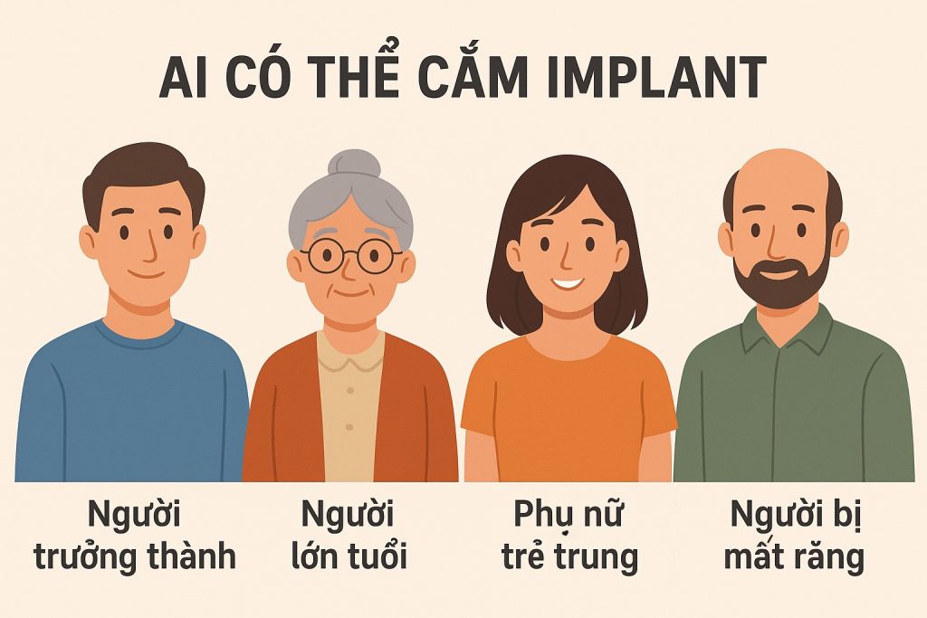✅ Người mất răng (mất 1 răng, nhiều răng hoặc mất toàn hàm) muốn phục hồi chức năng ăn nhai và thẩm mỹ.